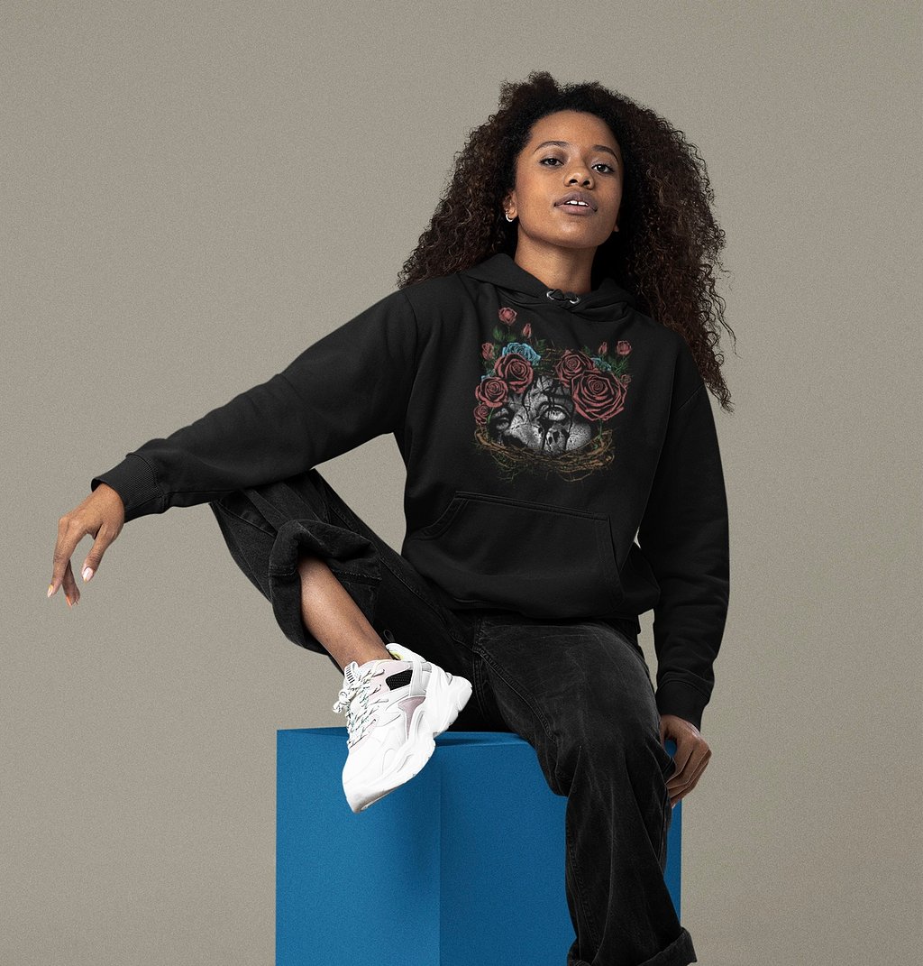 Dark elegance meets bold streetwear. The Crown of Thorns and Roses hoodie features a striking skull crowned with roses and thorns, blending gothic artistry with modern style. Crafted from a soft cotton blend with heavyweight fabric, it delivers comfort, warmth, and a statement look that won’t go unnoticed.